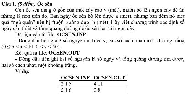 Một con ốc sên leo lên cột cao n mét. Ban ngày nó bò được a mét, ban đêm nó bị tụt xuống b mét. Hỏi mất ít nhất bao nhiêu ngày thì ốc sên lên lên đỉnh cột.