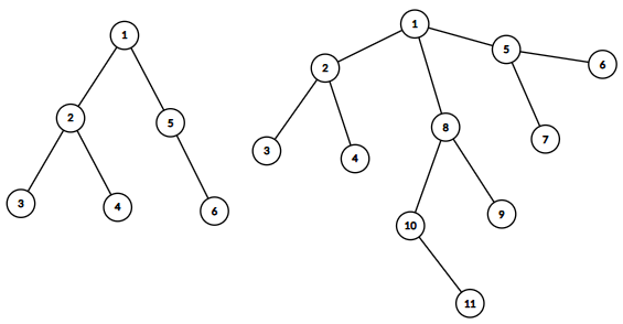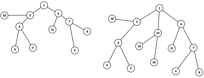 - ~N - 1~ dòng tiếp theo là hai số nguyên ~u_i, v_i(1 ≤ u_i, v_i ≤ n)~ biểu thị có cạnh nối giữa ~u_i~ và ~v_i~ trong cây.